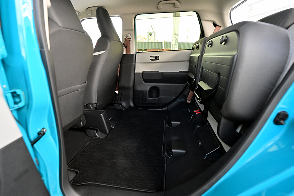 座面を跳ね上げれば背の高い荷物も積めますし、後席を倒せばフラットなスペースが広がり、日常の買い物からアウトドアまで柔軟に対応できます。