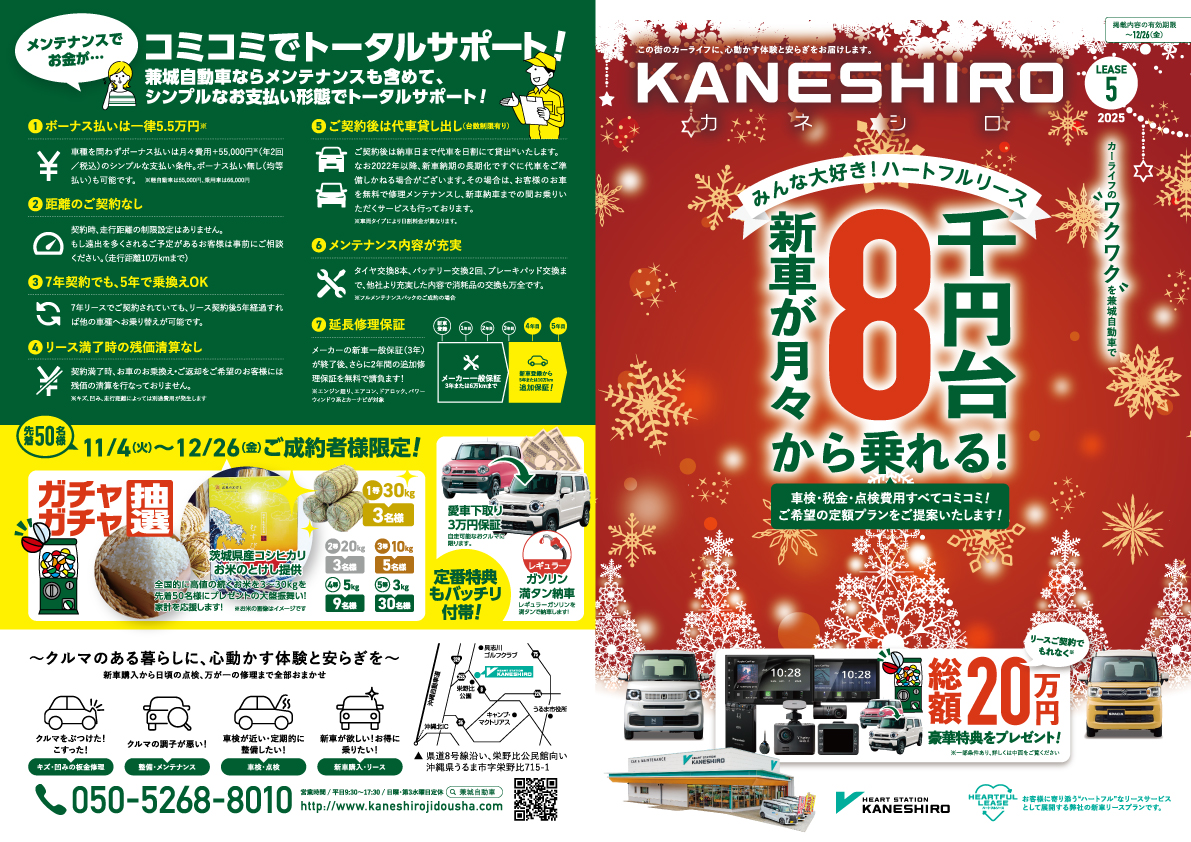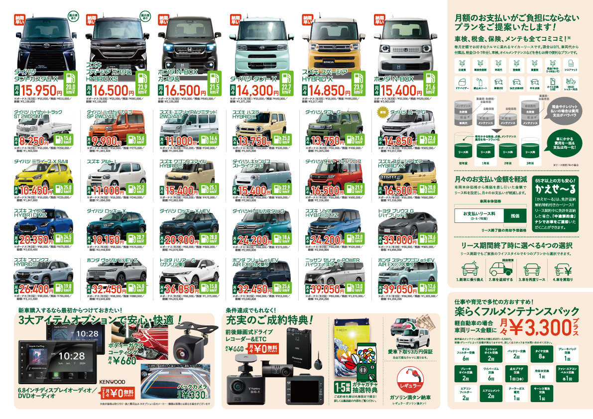 兼城自動車のハートフルリースプランは月々定額。税金や自賠責保険料、メンテナンス、車検費用もコミコミ。頭金0円!